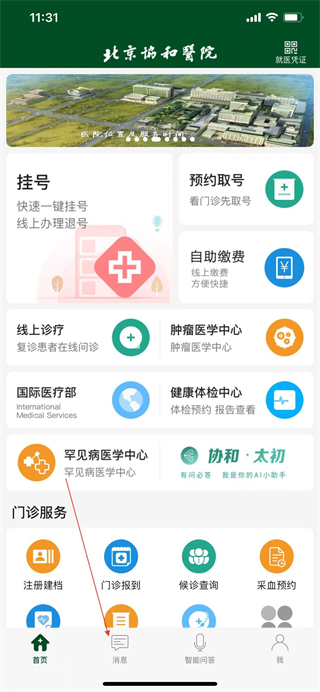 1、打開北京協和醫院APP首頁,點擊底部導航欄的消息選項。