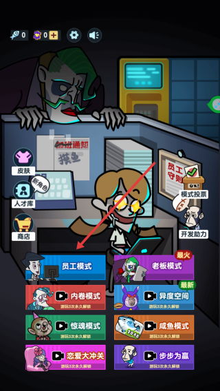 3、利用人才庫,商店等系統提升角色能力,切換模式老板模式等體驗不同玩法,推進游戲進程。
