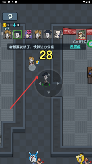 2、根據提示,如老板要發怒了,快躲進辦公室,移動角色避開危險,完成限時任務,獲取獎勵。