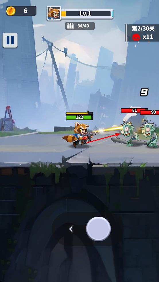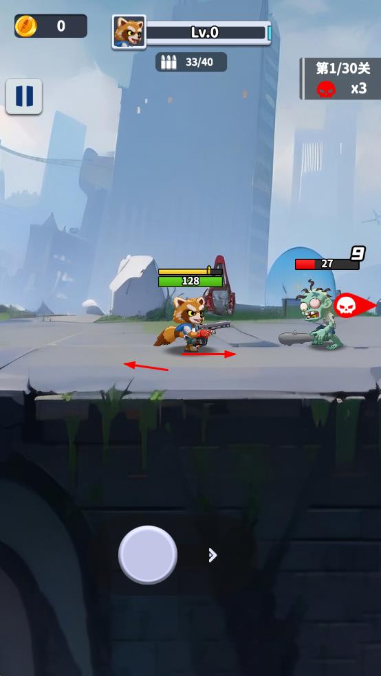 1、操控浣熊角色左右移動,瞄準僵尸類敵人進行射擊,消耗敵人血量,推進第1-30關等關卡進程。