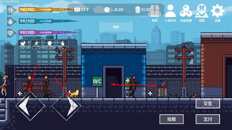 1、操控角色左右移動,在場景中對WC標識處等地點進行交互,還可使用拾取乞討功能,同時留意人物的饑餓、水分、健康等狀態條。