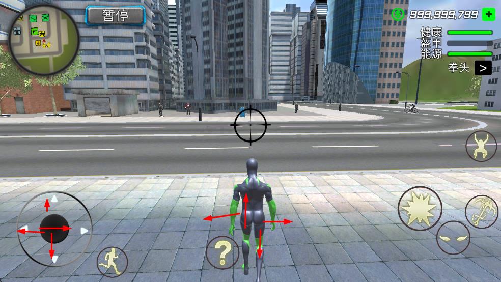 1、通過左側搖桿操控超級英雄在城市街道移動,留意右上角健康、盔甲、能源狀態,為冒險行動提供基礎保障。