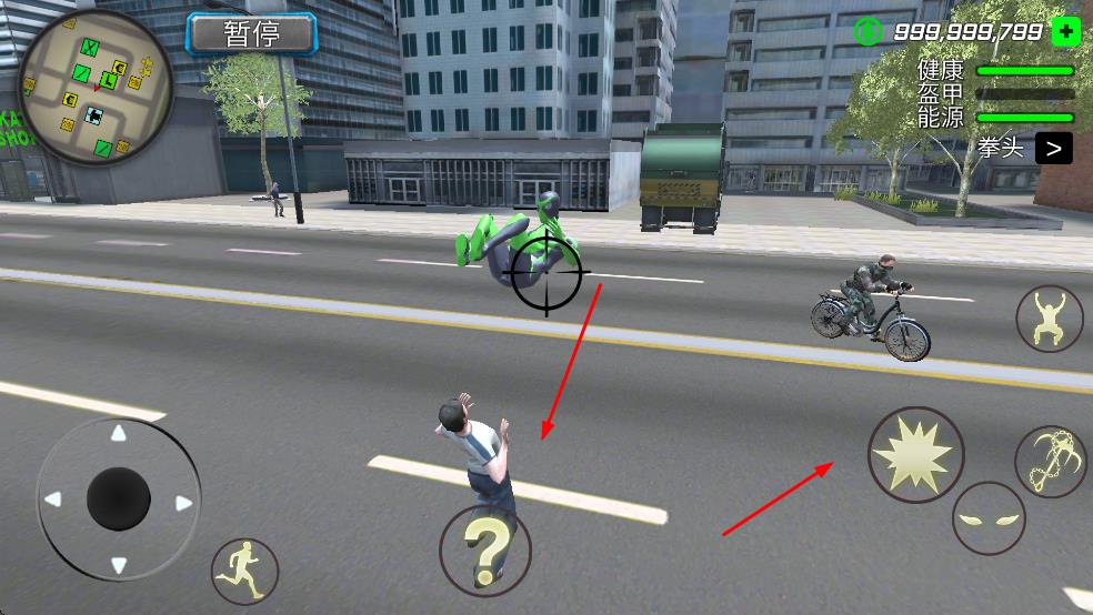 3、使用拳頭或爆炸類技能圖標,對城市中的目標發起攻擊,同時可與行人、車輛等互動,推進冒險進程。