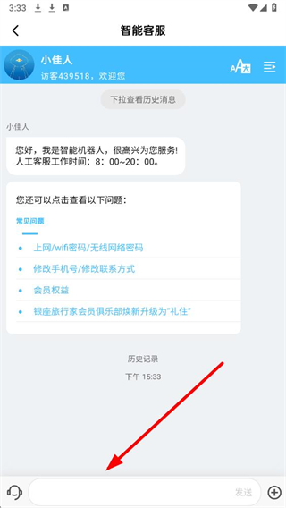 3、在智能客服頁面,可直接在輸入框中輸入咨詢內容,也可選擇常見問題快速獲取解答。