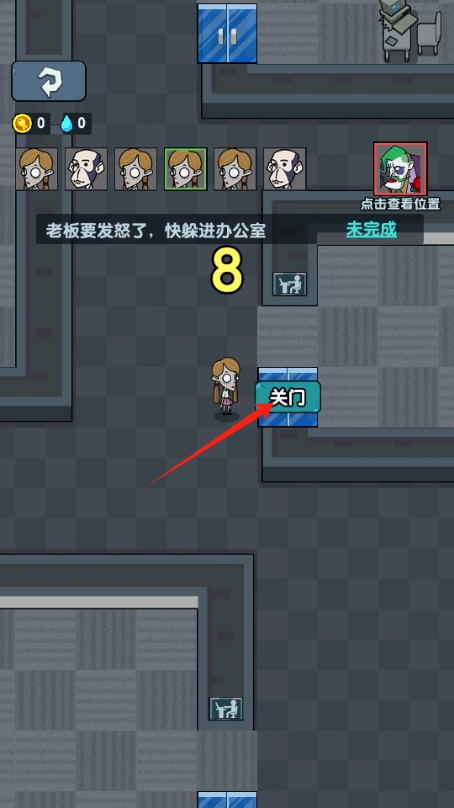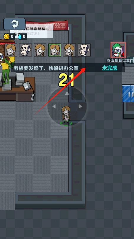 3、查看場景,上方出現老板要發怒了,快躲進辦公室的任務,規劃走進辦公室的路線,查看周圍環境。