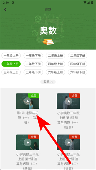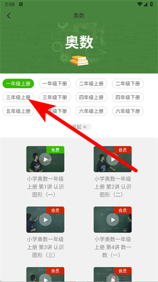 2、在奧數頁面,點擊三年級上冊選項,切換到對應年級的奧數內容。