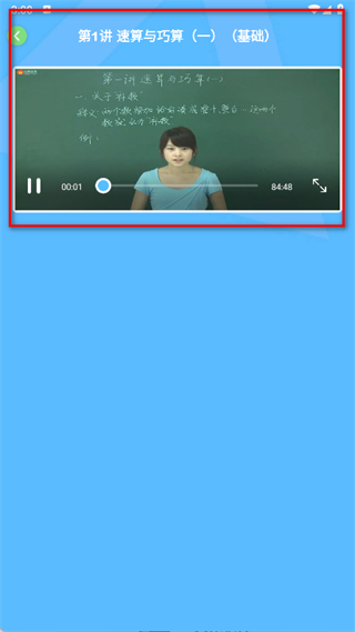 4、進入觀看界面,點擊視頻,第1講速算與巧算的課程視頻開始播放。