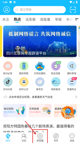 1、打開九曲河門戶網APP,點擊底部資陽圈選項,進入資陽圈頁面。