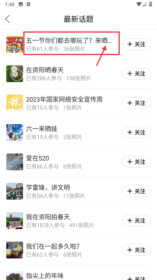 4、在最新話題列表中,點擊五一節你們都去哪玩了來曬...話題,進入話題詳情頁。
