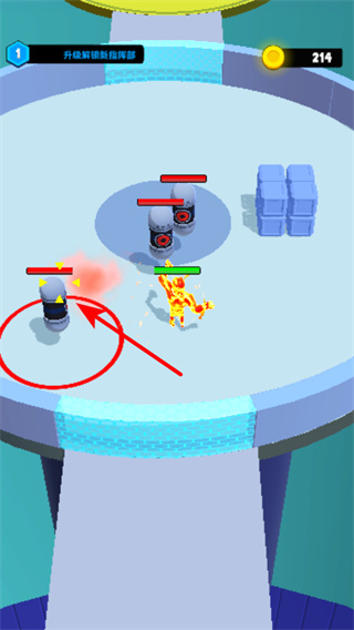 1、在游戲中操控英雄攻擊敵方機器人,攻擊操作是消滅敵人的關鍵操作,持續攻擊削減敵方血量,推進戰斗進程。