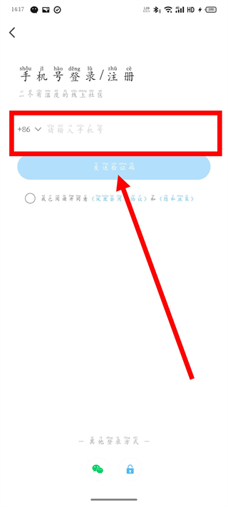 3、在手機號登錄注冊頁面,輸入手機號,點擊發送驗證碼。