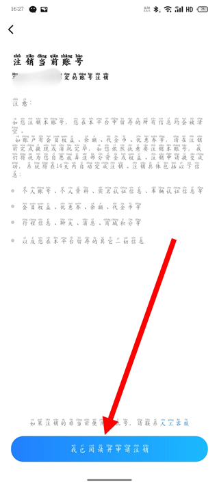 4、在注銷頁面,點擊我已閱讀并確定注銷按鈕,完成注銷。