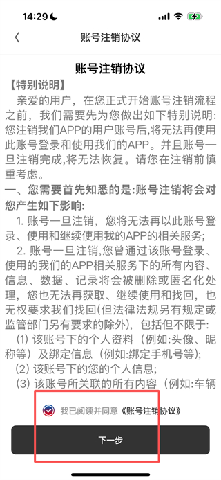 4、在賬號注銷協議頁面勾選同意后,點擊下一步進入驗證身份頁面。