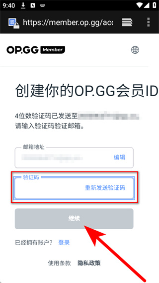 4、將發送到該郵箱的驗證碼填入驗證碼欄,點擊繼續,后續按提示完成設置,即可完成OPGG的賬號注冊。