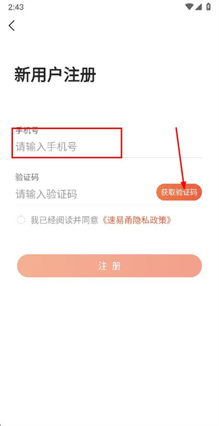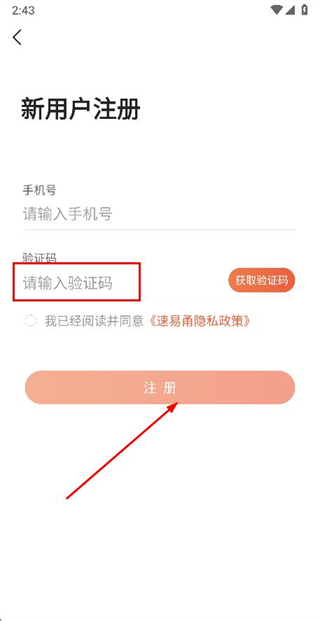 3、在注冊賬號頁面填寫驗證碼和密碼,勾選協議后點擊注冊完成注冊操作。