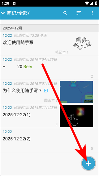 1、在隨手寫的筆記列表頁面,點擊右下角的加號按鈕,進入新建一條筆記頁面。