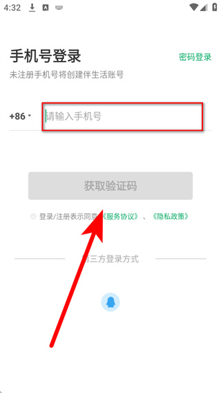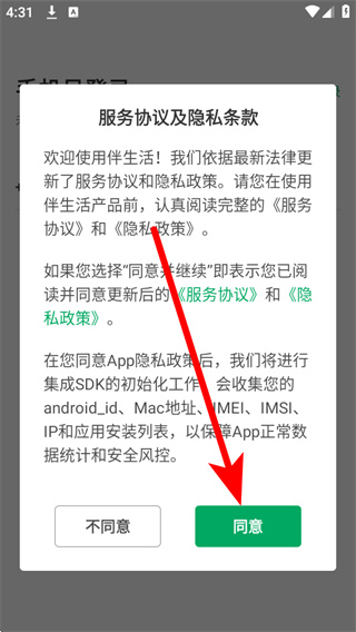 1、打開伴生活,在彈出的彈窗中點擊同意,進入登錄頁面。