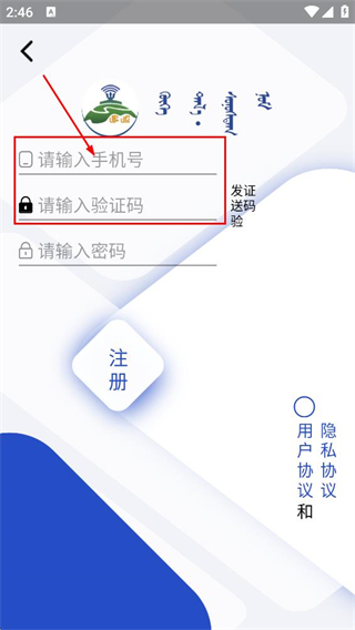 2、在注冊頁,填寫請輸入手機號,點擊發送驗證碼后填寫請輸入驗證碼。