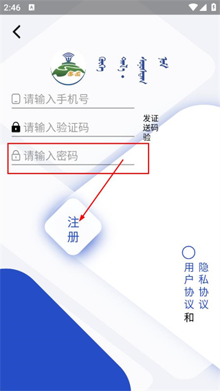 3、填寫請輸入密碼,勾選用戶協議和隱私協議后,點擊注冊按鈕,完成注冊。