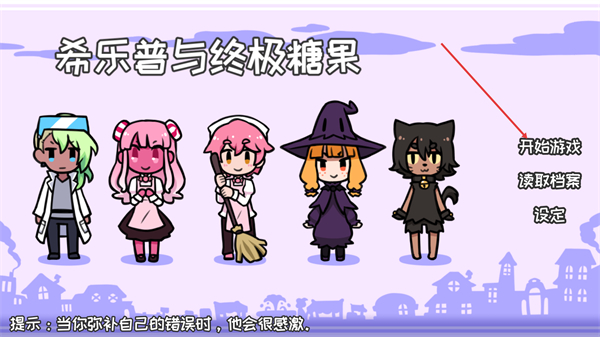 1、在希樂普與終極糖果界面,可選擇開始游戲進入游戲,也能通過讀取檔案找回進度、設定調整游戲參數,同時留意界面的提示信息。