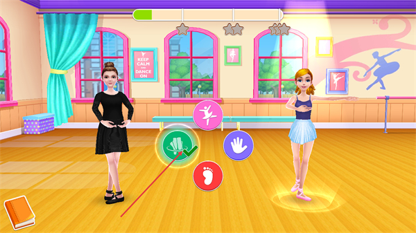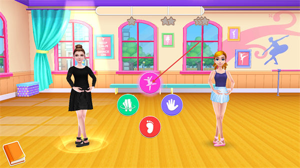 2、進入芭蕾舞教室界面后,找到中間的舞蹈、手勢類操作按鈕,跟隨哦爾科特小姐學習對應的芭蕾舞動作。