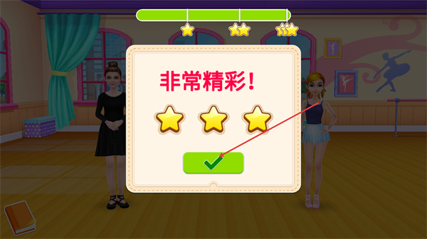 4、完成練習后出現非常精彩的三星評價彈窗,點擊彈窗內的對勾按鈕,確認評價并推進后續的學習流程。