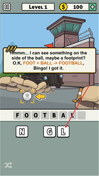 3、在游戲關卡中,觀察到足球作為線索后,需將FOOT與BALL組合成FOOTBALL,按提示操作即可推進關卡。