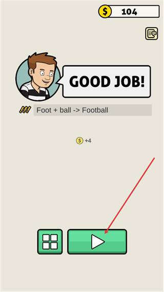 4、成功組合出Football后,會獲得GOODJOB的反饋及+4金幣獎勵,點擊綠色按鈕可繼續進行游戲。