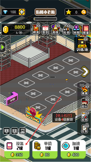 1、在不打街機不回家的主界面中,點擊底部的設備2級按鈕,消耗350金幣即可升級設備,提升機廳的運營相關能力,后續還能解鎖更多功能。