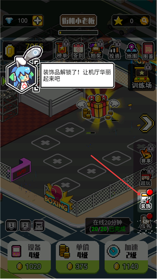 2、當界面出現裝飾品解鎖了,讓機廳華麗起來吧的提示后,點擊右側的裝飾按鈕,即可進入裝飾界面,為機廳配置裝飾元素。