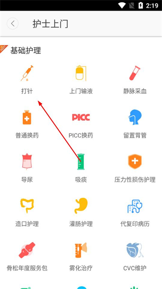 1、打開醫護到家,在首頁點擊護士上門基礎護理選項。