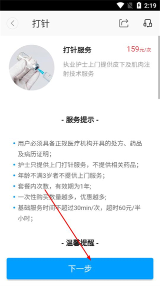 3、在打針服務頁面,閱讀服務提示后點擊下一步。