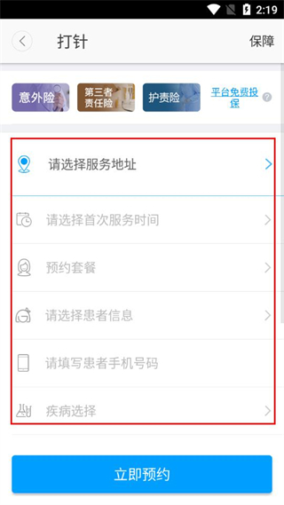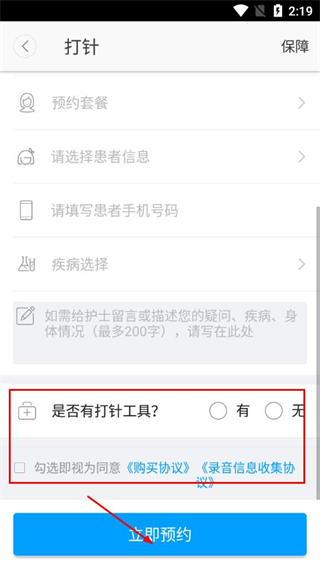 5、選擇是否有打針工具并勾選協議,點擊立即預約完成下單。