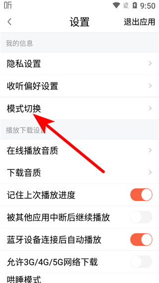 3、在設置頁面,點擊模式切換選項,彈出模式選擇列表。