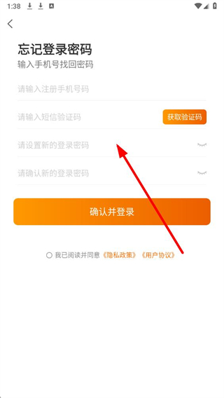 4、在頁面依次輸入手機號、獲取驗證碼、設置新密碼,勾選協議后,點擊確認并登錄,即可找回并登錄賬號。