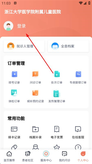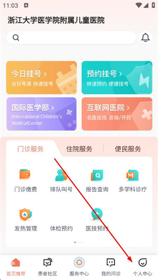 1、打開浙大兒院APP,點擊底部導航欄的個人中心選項。