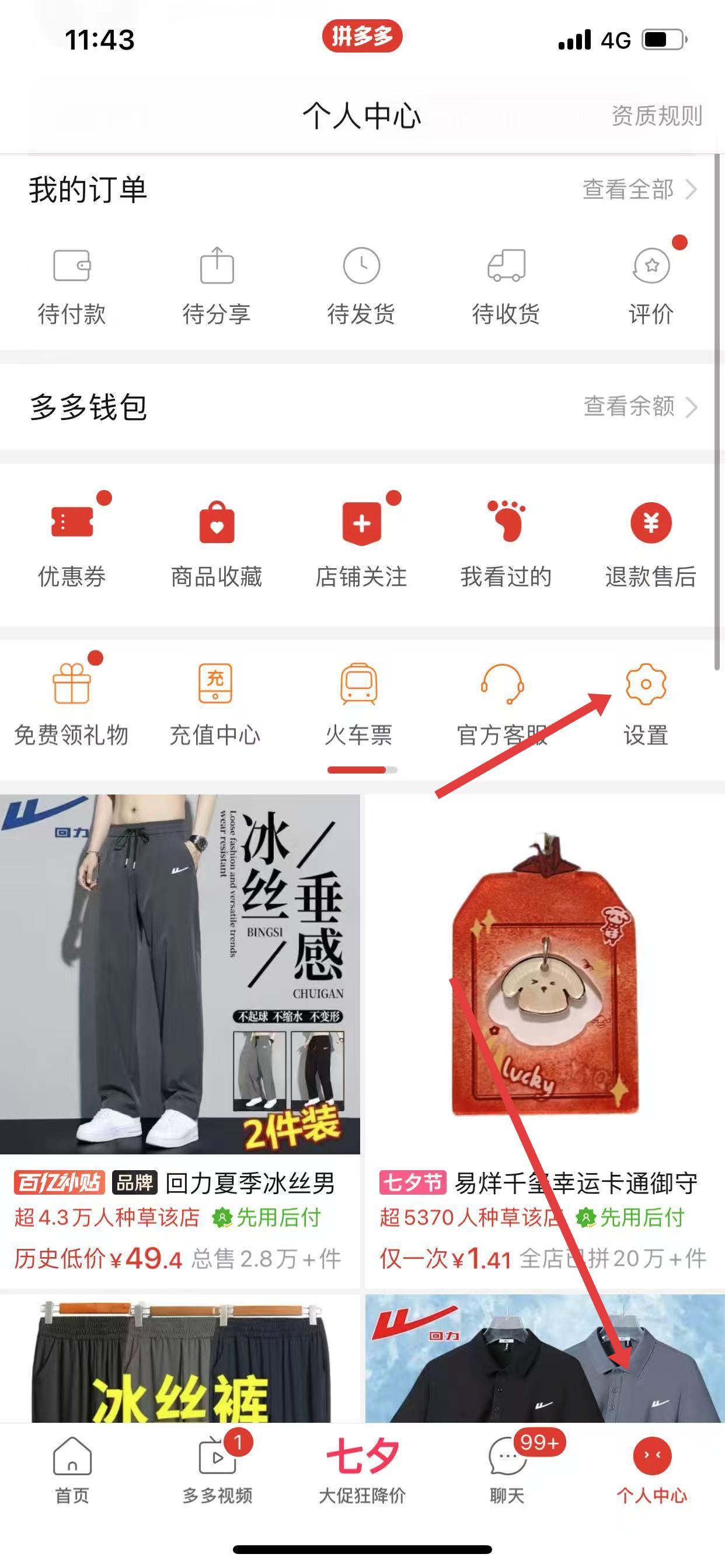 1、打開拼多多APP,點擊底部導航欄最右側的個人中心,進入個人中心界面,點擊設置選項進入。