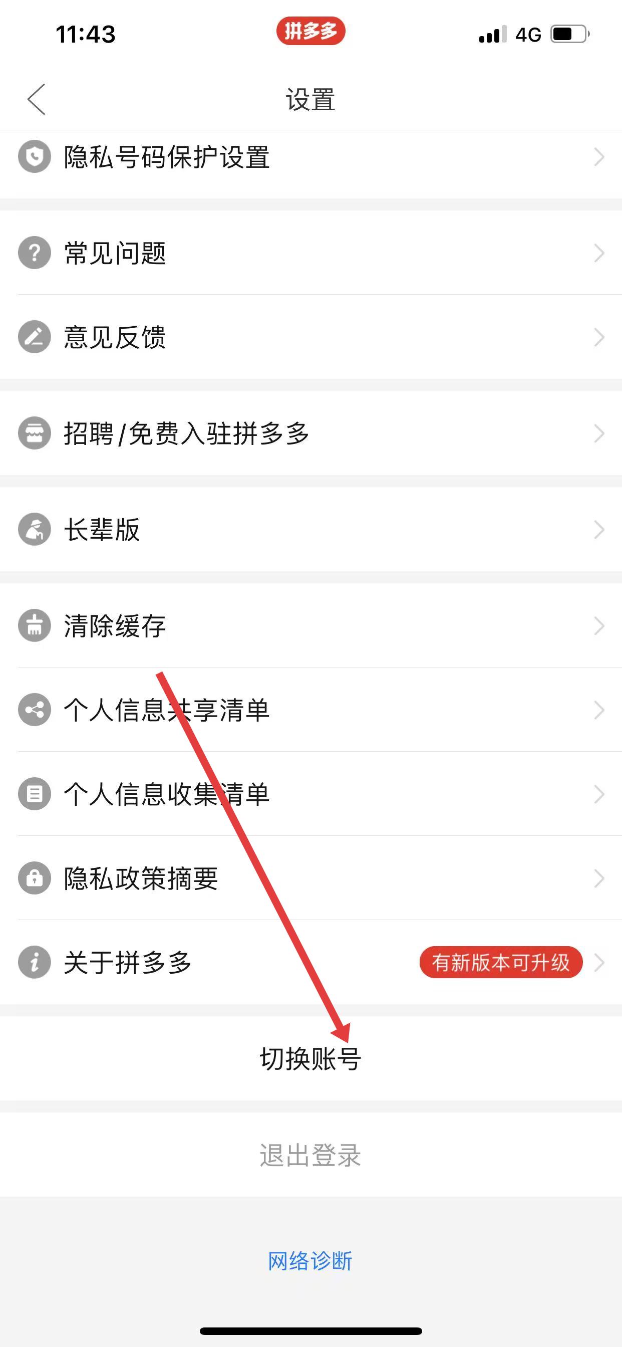 2、進入設置頁面后,下滑屏幕,在下方位置點擊切換賬號這一選項。