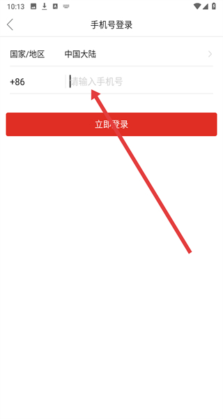 3、在進入到手機號登錄頁面中,點擊上方輸入框填寫手機號后,點擊立即登錄按鈕。