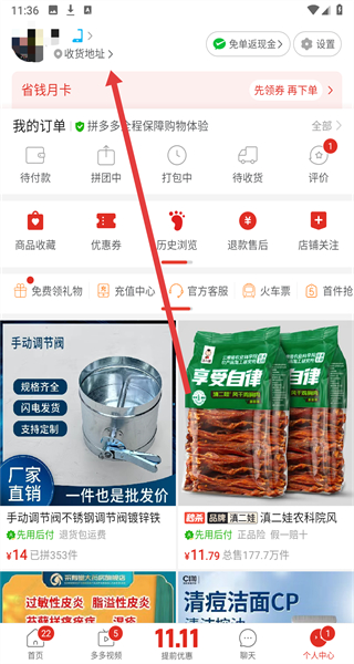 2、在個人中心頁面中,可通過點擊收貨地址按鈕,進入查看相關設置。