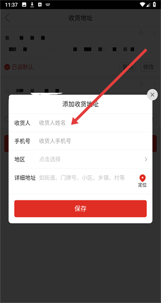 4、在彈出添加收貨地址彈窗時,需點擊輸入框依次填寫相關信息后,點擊保存即可完成操作。