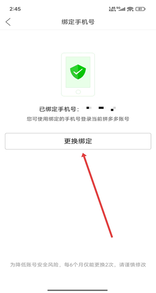 2、在綁定手機號頁面點擊“更換綁定”,進入更換綁定手機號的驗證頁面。